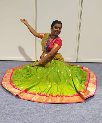 Apart from being a professional Kathak dancer, she is also trained in various folk dance forms under the tutelage of Late Guru Indumati Lele ji, as well as Latin dance forms such as Salsa (ON1 and Cuban), Bachata and Kizomba through Rocky Poonawala Dance Studio, Pune and The Tribe Dance Academy, Cork.